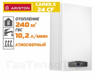 Ariston Cares X 24 CF — двухконтурный навесной котел для обеспечения тепла жилых домов площадью до 240 квадратных метров. Котлу Аристон Cares X 24 CF для нормальной эксплуатации необходимы отдельно стоящий дымоход и приточная вентиляция.