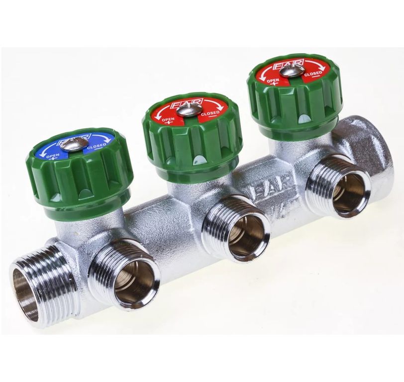 Применяется для распределения потоков жидкостей в контурах теплого пола, радиаторного отопления, холодного и горячего водоснабжения. Латунный никелированный коллектор на 2, 3 и 4 выхода диаметром 1". На каждом выходе предусмотрен вентиль для регулирования расхода рабочей среды. Рабочая температура теплоносителя – до 110 °С, давление – до 10 бар.
