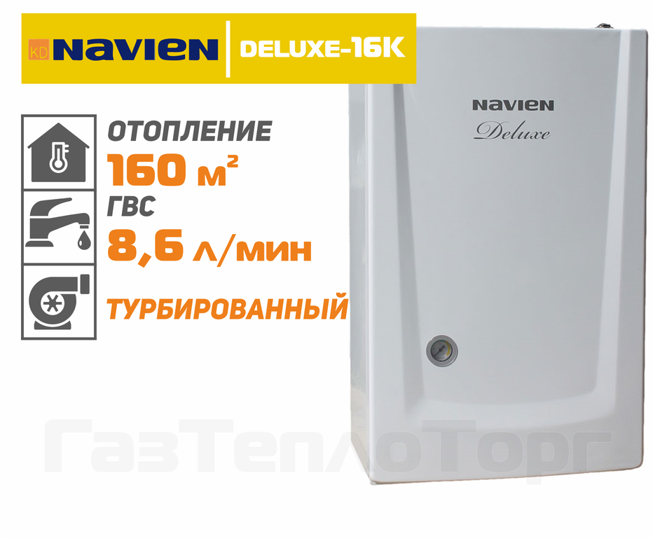 Данная модель Navien Deluxe 16K способна отопить жилые дома, производственные постройки от 90 до 160 м² и дать 8,6 литров горячей воды для бытовых нужд в минуту.