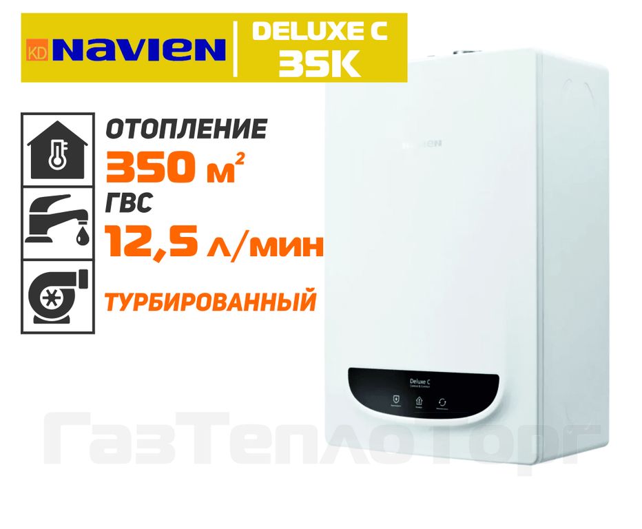 Данная модель Navien Deluxe C 35K способна отопить жилые дома, производственные постройки от 90 до 350 м² и дать 12,5 литров горячей воды для бытовых нужд в минуту.