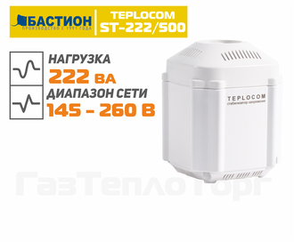 Teplocom ST-222/500, общей мощностью 200 ВА, может использоваться в качестве стабилизатора напряжения для настенных турбированных (закрытая камера сгорания) и атмосферных (открытая камера) котлов с активной потребляемой мощностью до 140 Вт.