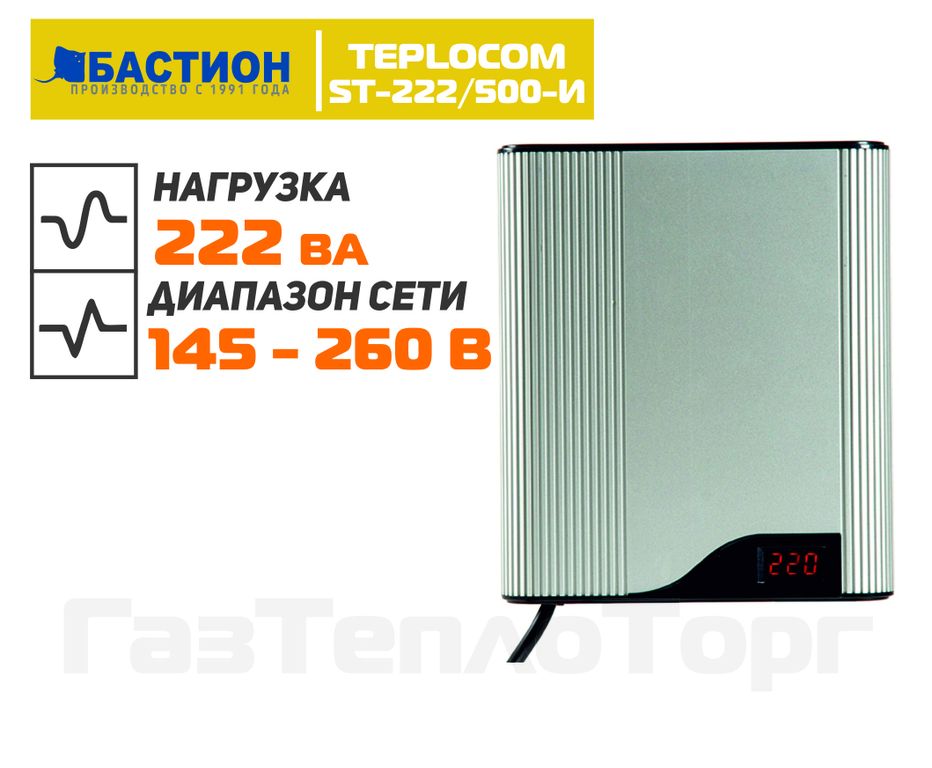 Teplocom ST-222/500-И, общей мощностью 200 ВА, может использоваться в качестве стабилизатора напряжения для настенных турбированных (закрытая камера сгорания) и атмосферных (открытая камера) котлов с активной потребляемой мощностью до 140 Вт.