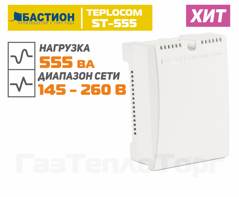 Teplocom ST-555, общей мощностью 400 ВА, может использоваться в качестве стабилизатора напряжения для настенных турбированных (закрытая камера сгорания) и атмосферных (открытая камера) котлов с активной потребляемой мощностью до 280 Вт.