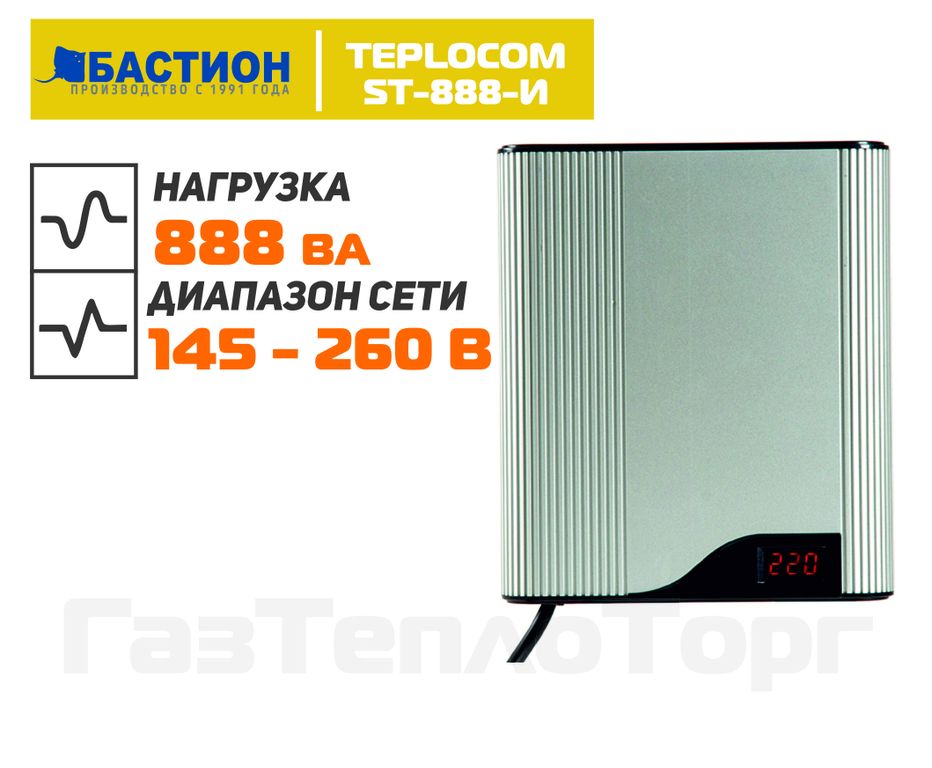 Teplocom ST-888-И, общей мощностью 600 ВА, может использоваться в качестве стабилизатора напряжения для настенных турбированных (закрытая камера сгорания) и атмосферных (открытая камера) котлов с активной потребляемой мощностью до 420 Вт.